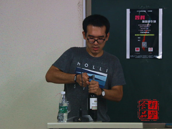 的张腾学长首先从葡萄酒的历史开始,向同学们介绍了葡萄酒的礼仪,侍酒与品酒等相关知识,通过学长的讲解,同学们对葡萄酒有了初步的了解。在接下来的演讲过程中,葡协的干事们为在场的众人依次倒上的“长相思”、“美了”、“赤霞珠”、“茜拉”将酒会送入了高潮。张腾学长带领着同学们进行了品酒:观色、闻香、品尝、总结这四个步骤。这四款酒均产自智利,张腾学长为大家讲述了有关于智利葡萄酒产区的基本概况,让同学们受益匪浅。品尝美酒的同时张腾学长又介绍了选酒所依循的环节,只有选对了酒才更能品尝出葡萄酒的魅力。