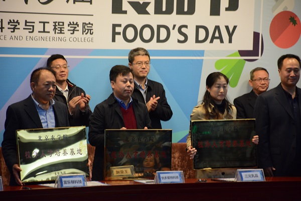 共同倡议,建立了食品专业大学生创新创业实践教育联盟,还举办了大学生专业实习基地签约、授牌仪式。北京市实习基地北京红叶葡萄酒有限公司总工程师刘文忠作为企业代表发言,他认为学校与企业的合作是双赢的,学生是最具创新能力的,并对本次食品节表示了美好祝愿。
