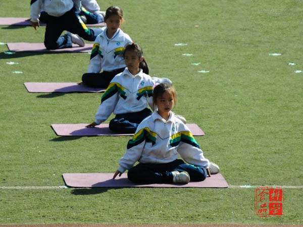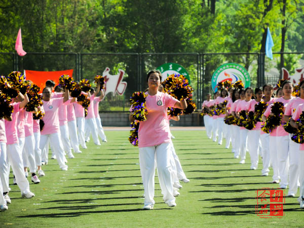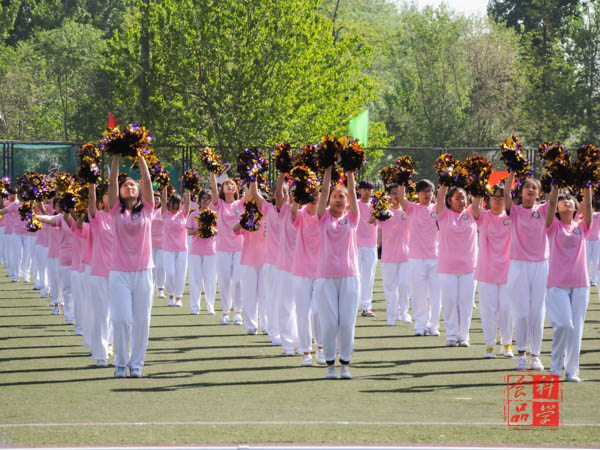 在啦啦操的表演中,同学们动作整齐划一,近一个月的艰苦训练终于凝结成精彩的表演献给全体师生及运动员。