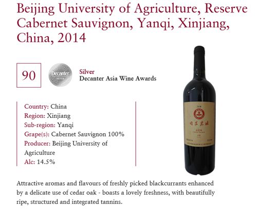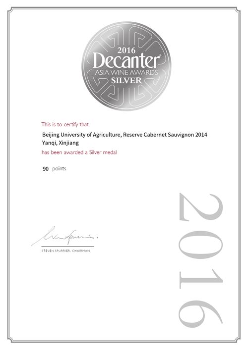 选送的“北农庄园”2014年份珍藏赤霞珠干红葡萄酒以90分荣获银奖。