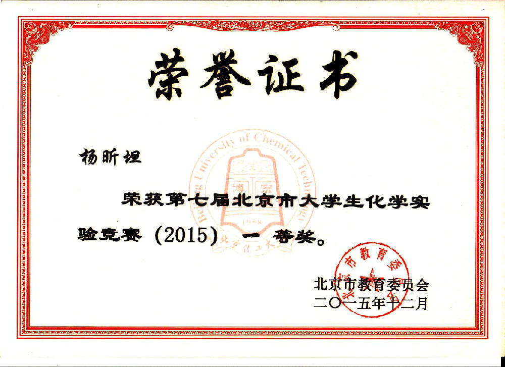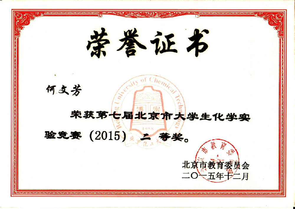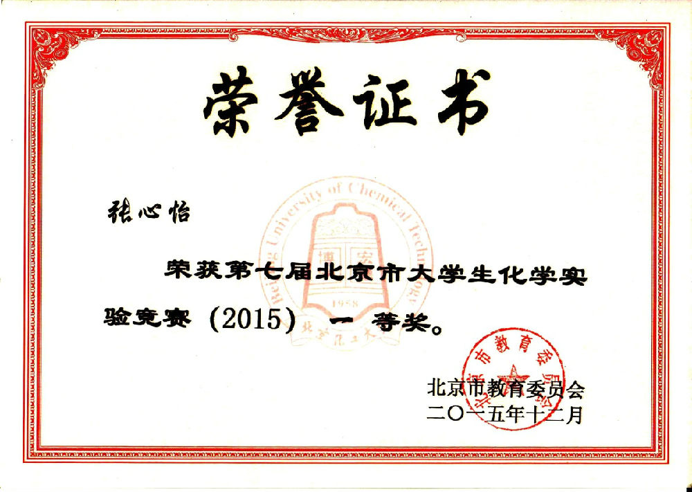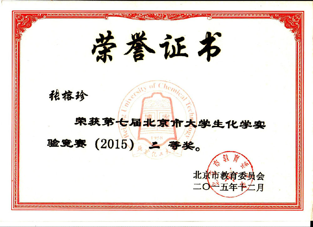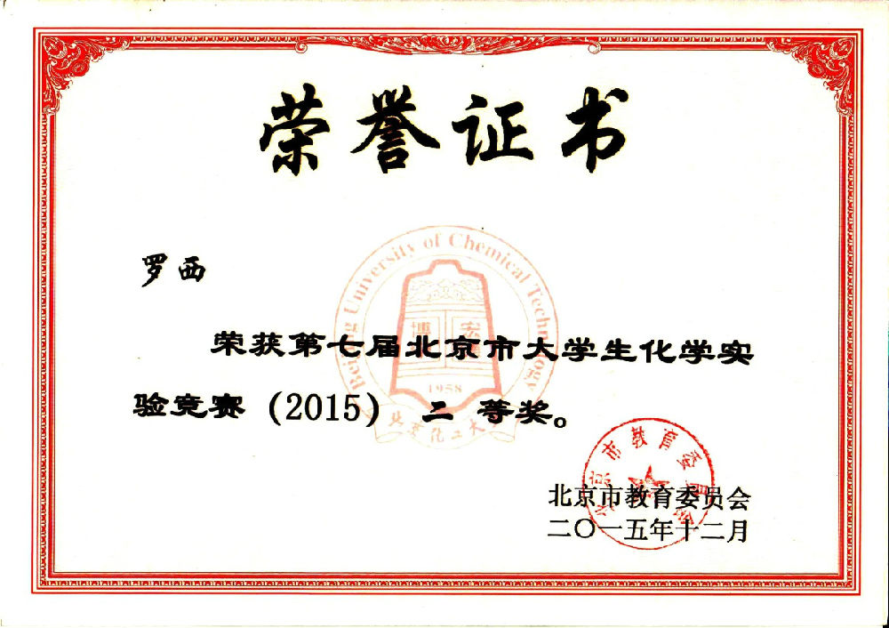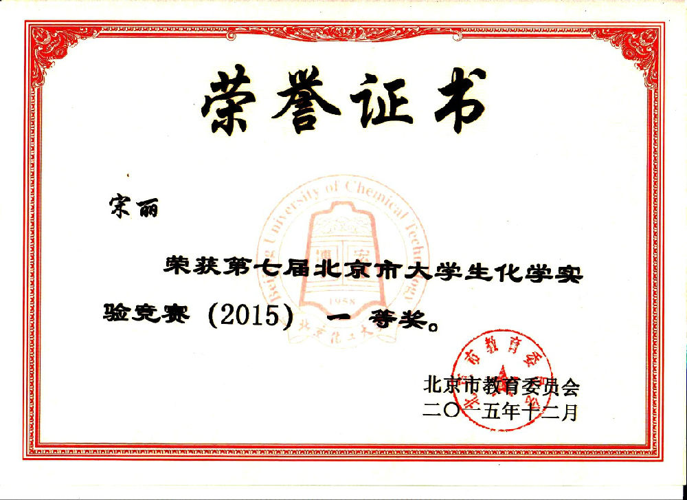 在2015年第七届北京市大学生化学实验竞赛中,我校十名参赛选手再创佳绩,实现我校参赛以来新的突破。我校十名参赛队员全部获奖,且获一等奖五名,二等奖四名,三等奖一名。
