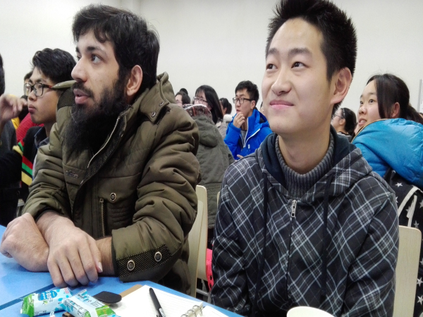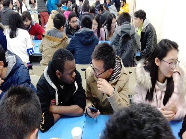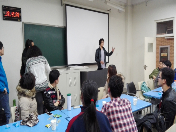 到场的同学出乎意料的多,教室里座无虚席。大家的热情也都很高,交流畅快。六点半正式开始,首先由我校马子泓同学为大家介绍中国的特色菜品及制作方法,ppt上色泽艳丽的图片吸引着大家的眼球。简单介绍了一番之后,大家开始自由交谈,聊天的内容很广泛。随后进行了猜单词,读绕口令等游戏,气氛十分活跃。在聊天过程中,主办方还给大家发了小零食,聊的也很尽兴,吃的也很尽兴。
