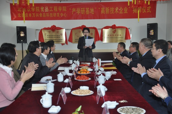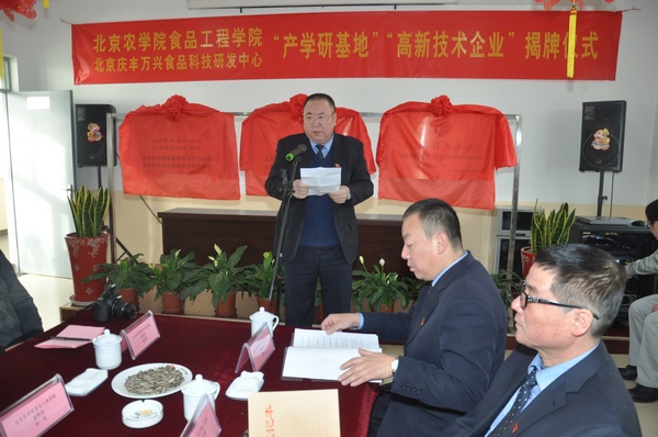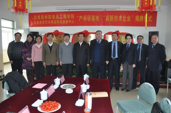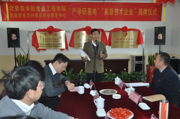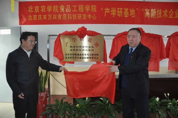 范双喜副校长和朱玉岭总经理为双方“教师科研合作基地、成果转化示范基地、3+1教学实践基地”和“高新技术企业”揭牌。仪式结束后,双方为下一步的具体合作进行了座谈。会后,范校长一行参观了庆丰包子铺的馅料加工车间。