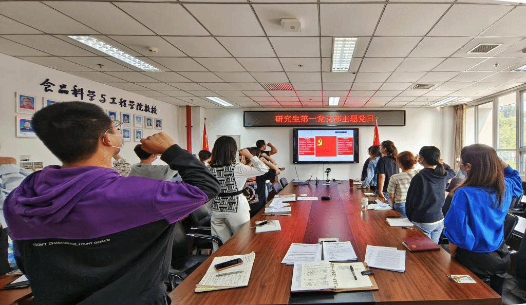 研究生第一党支部书记杨丰瑞带领全体党员重温入党誓词,支部全体党员面向党旗高举右拳庄严宣誓,誓词铿锵有力、掷地有声。重温入党誓词提醒每名党员牢记对党的庄严承诺,以实际行动践行初心使命。