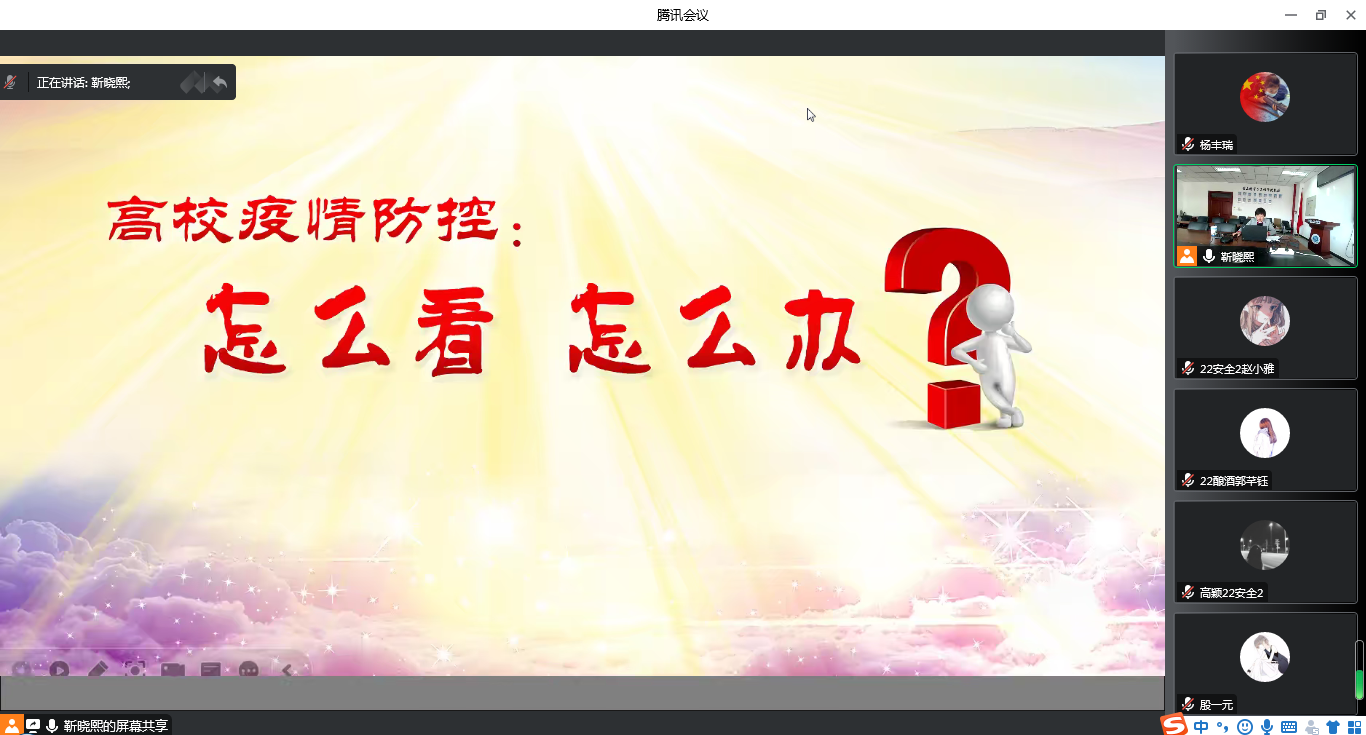 大家通过分析我国历史上的传染病防控经验、现实情况以及三年来疫情防控的效果,详细讲解了我们为何不能躺平、不必躺平,现阶段高校防控政策是严中有变、严中有精、严中有爱,高校疫情防控政策通过不断优化调整、更加精准,充分体现出高校守护师生生命健康的坚定决心。号召广大学生做自身健康的第一责任人,支持学校和属地疫情防控规定,发挥防疫正能量,贡献北农学子力量。