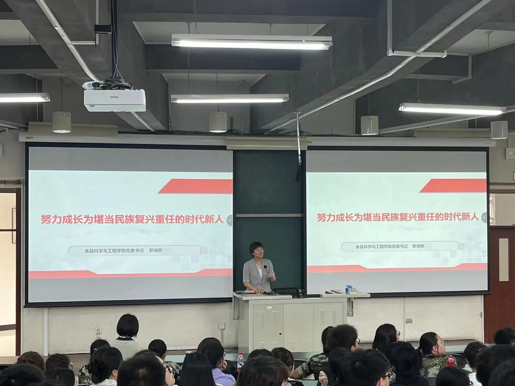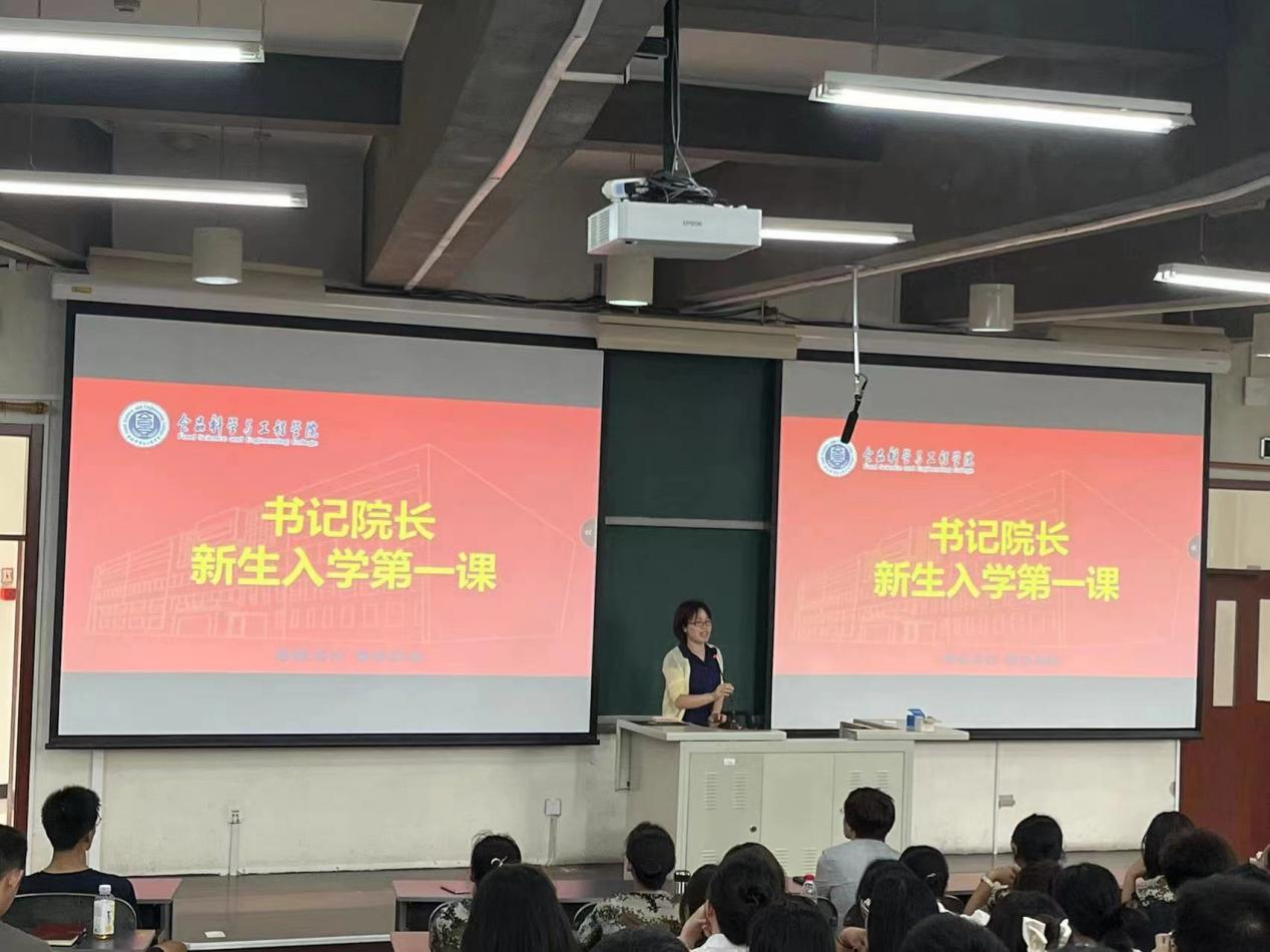 党委书记靳晓熙以“努力成长为堪当民族复兴重任的时代新人”为题,从理想和信念、求得真学问和实践长真才三个方面讲授了新时代大学生应有的责任和担当。她结合青年实际,引导新生坚定理想信念,厚植爱国情怀;希望同学们在大学生活中处理好“思维与知识、通识与专业、有用和无用”的关系,既向书本学、也向实践学,全面综合发展;号召大家以主人翁的责任,争做文明校园的建设者,一起携手共建文明校园。