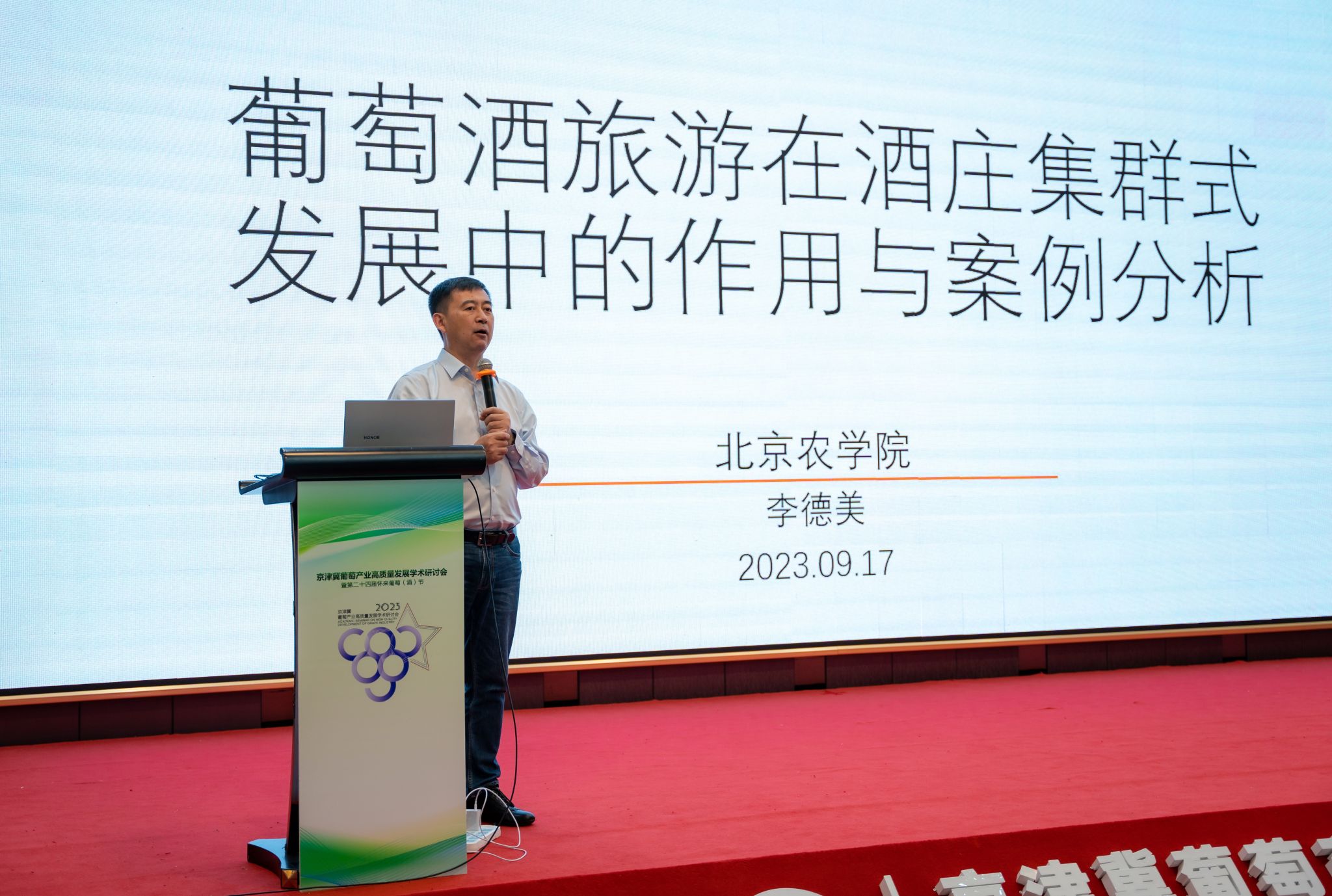酿酒工程系系主任李德美教授、酿酒工程本科生党支部书记魏晓峰及2名本科生代表参会。研讨会由中国农学会葡萄分会主办,中共怀来县委、怀来县人民政府、河北省葡萄与葡萄酒学会承办,吸引了来自全国各地葡萄产业相关领域专家学者、葡萄产业经营者、生产种植组织和葡萄酒企业代表参加。中国农学会葡萄分会会长刘俊,张家口市委常委、宣传部长燕旺林,怀来县委副书记、县长张琪等领导和嘉宾出席开幕式。