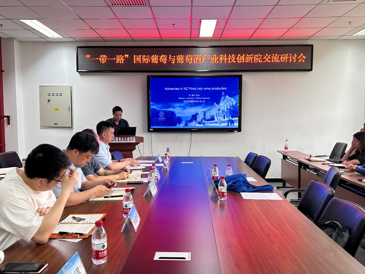 学术交流环节,新西兰林肯大学的田斌博士以《新西兰‘黑皮诺’生产的进展》(Advances in New Zealand Pinot noir production)为题目作了专题报告,详细介绍了新西兰在‘黑皮诺’葡萄种植和葡萄酒生产方面的最新研究成果和实践经验。张欣珂副教授结合最近研究工作开展情况,作了题目为《基于陶罐体系的模拟橡木桶陈酿葡萄酒风味与感官特点研究》的介绍,深入分析了陶罐体系在模拟橡木桶陈酿过程中对葡萄酒风味和感官特性的影响,展示了“一带一路”国际葡萄与葡萄酒产业科技创新院的最新研究成果。