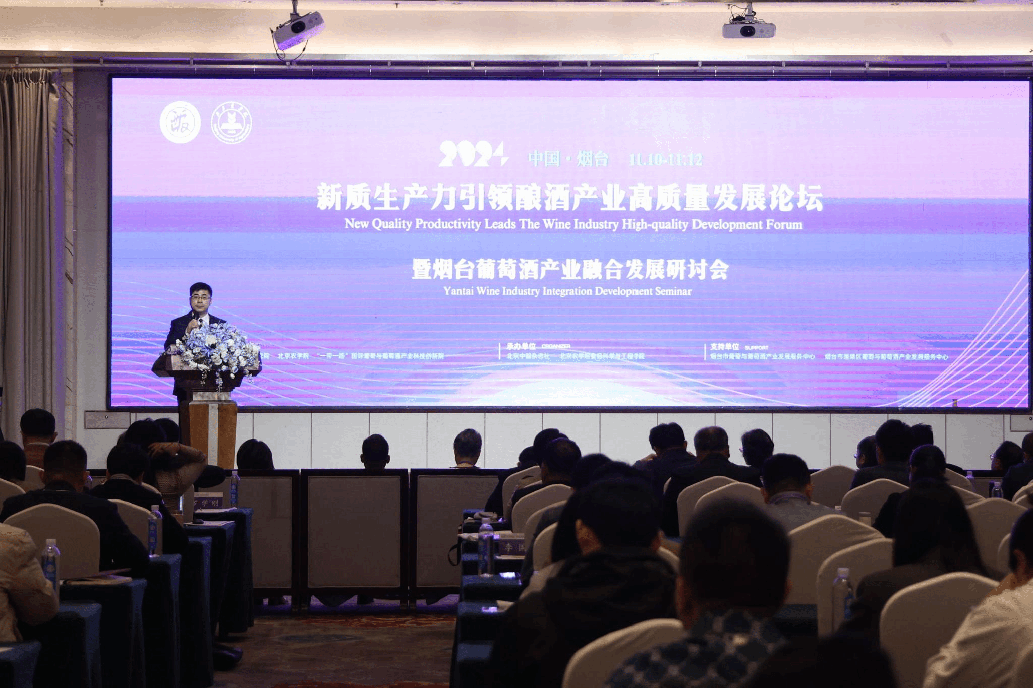 11月10日-12日,“新质生产力引领酿酒产业高质量发展论坛暨烟台葡萄酒融合发展研讨会”在山东烟台顺利召开。此次会议由我校“一带一路”葡萄与葡萄酒产业科技创新院和北京食品科学研究院联合主办,旨在探讨新质生产力在酿酒产业中的应用,促进酿酒产业产学研用深度融合。我校党委常委、副校长张德强,北京食品科学研究院院长赵燕出席开幕式并致辞。烟台市及蓬莱区葡萄与葡萄酒产业发展服务中心等管理部门领导出席开幕式。中国农业大学、西北农林科技大学、江南大学、北京工商大学等高校专家学者、学生代表以及知名酒企从业人员200余人在线下参加会议。