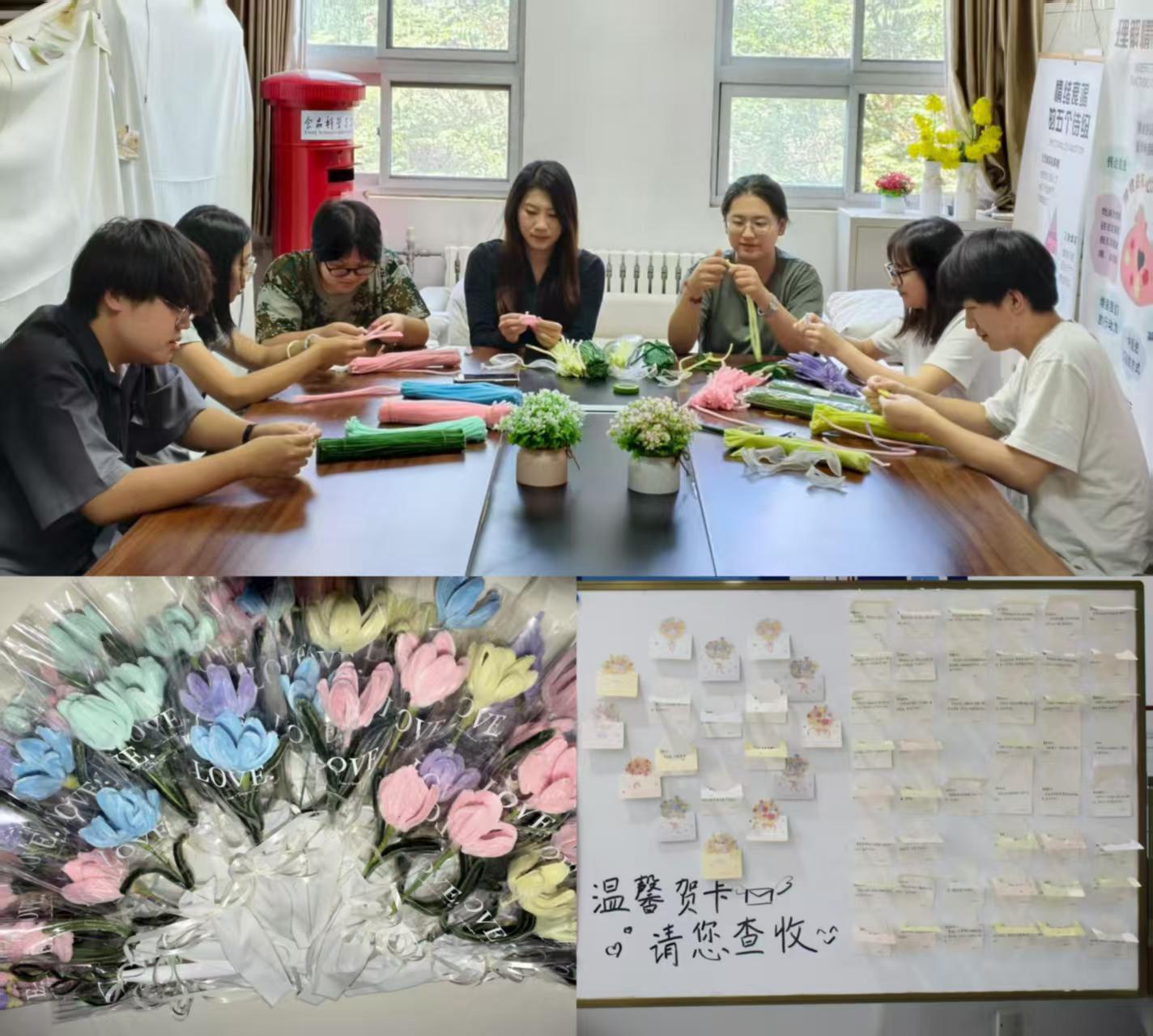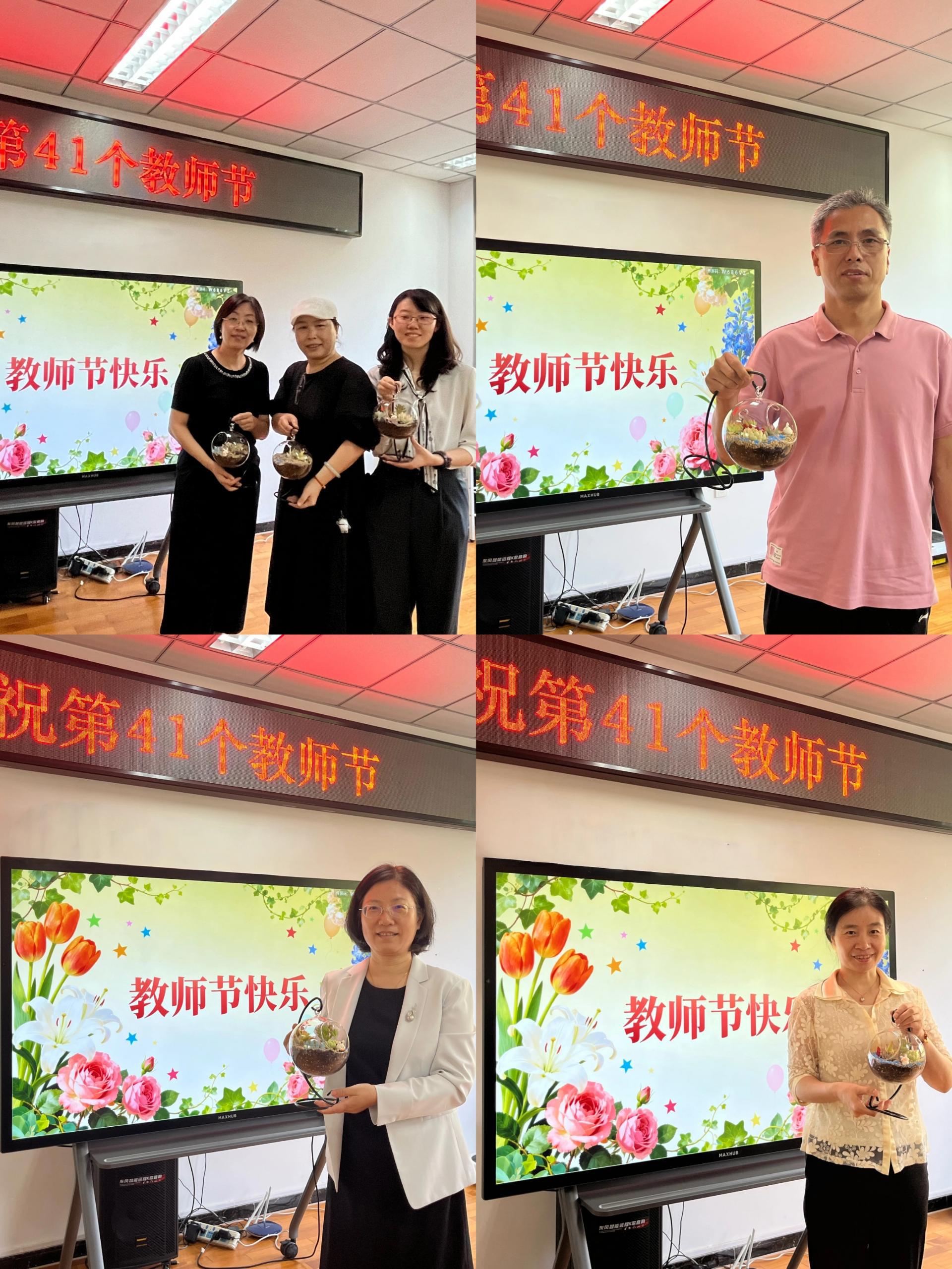 学子亲手制作手工花,祝福墙上贴满了温馨贺卡。教师节当天,老师们惊喜地领取DIY花束和专属贺卡,在花香与祝福中感受节日的温暖与喜悦。