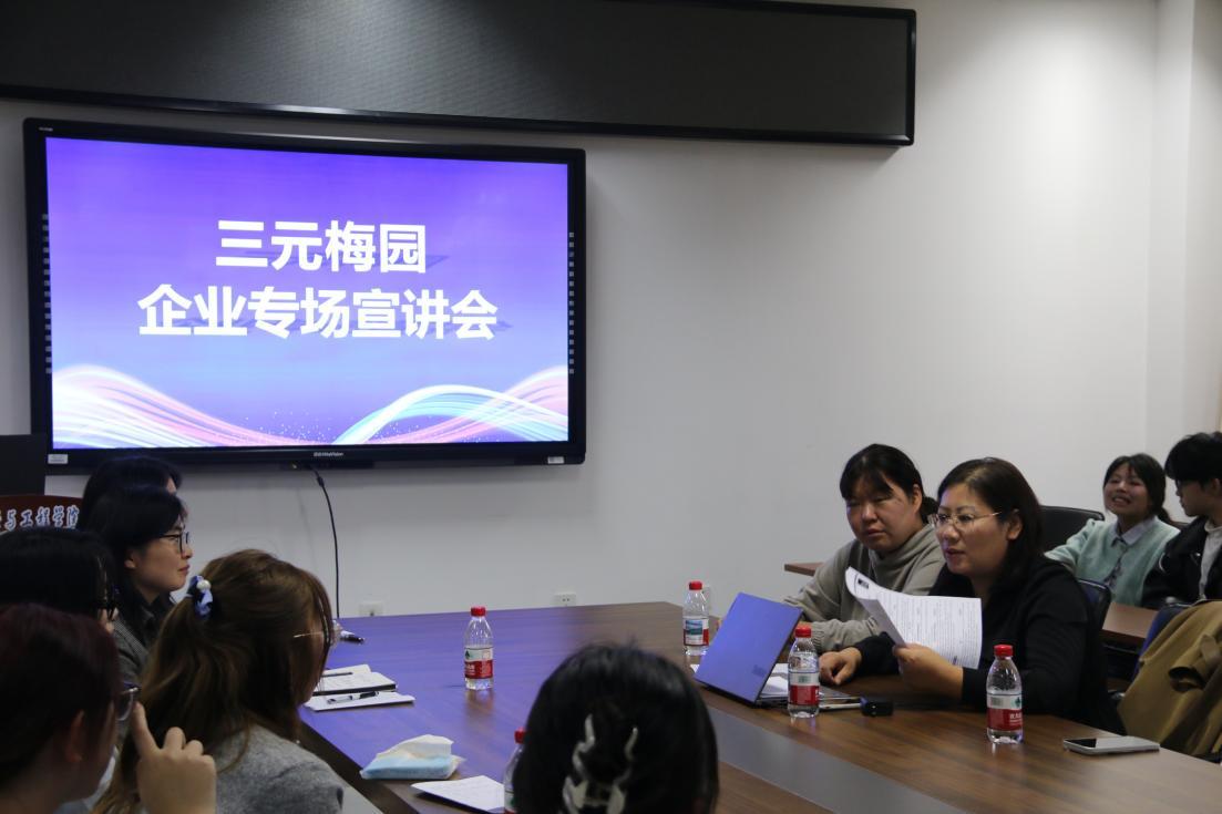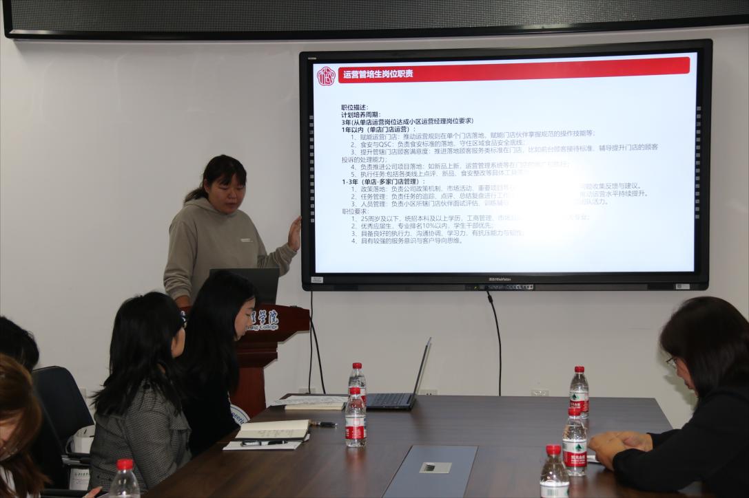 宣讲会上,三元梅园品牌市场中心经理王倩向同学们全面介绍了企业的发展历程、核心业务板块及人才晋升体系,使同学们深刻感受到了企业的独特魅力。随后,人力专员赵咏琪详细阐述了此次招聘的运营管培生岗位的职责及晋升路径。