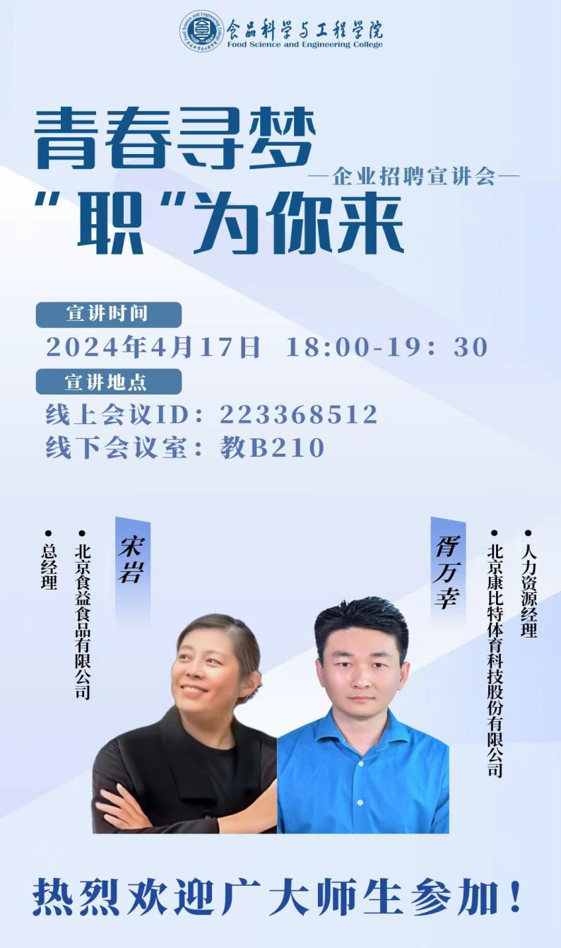 举办“青春寻梦,‘职’为你来”企业招聘宣讲会,会议邀请北京食益食品有限公司和北京康比特体育科技股份有限公司两家企业到学校进行招聘宣讲活动。Coral博彩